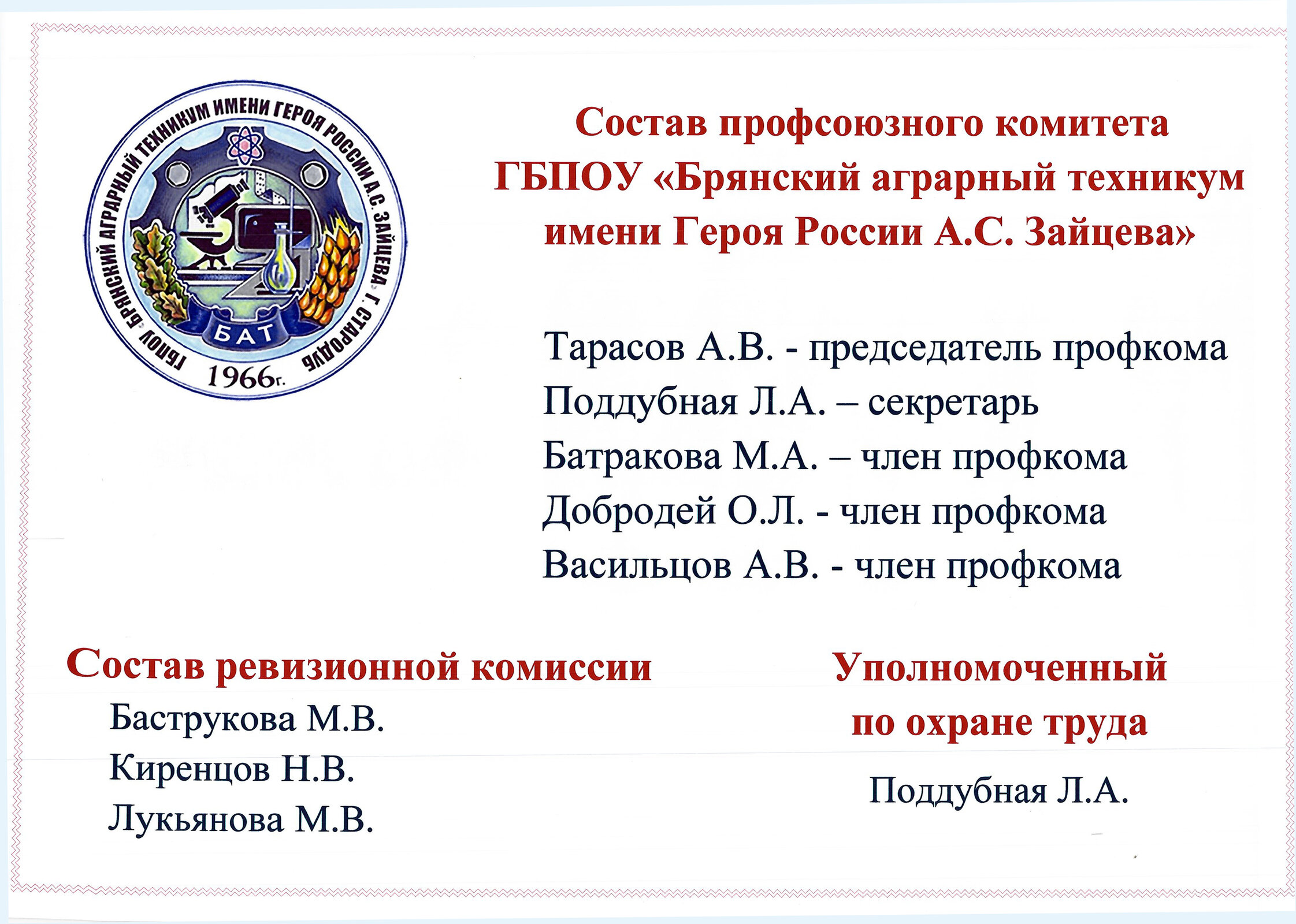 Первичная профсоюзная организация ГБПОУ «Брянский аграрный техникум имени Героя России А.С. Зайцева» создана с целью повышения социальной защиты работников техникума. Профсоюзная организация живёт заботами и проблемами учреждения, защищает, отстаивает социально-экономические и трудовые права и интересы работников. Первичная профсоюзная организация техникума входит в структуру Брянской областной организации Профсоюза.